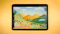 Paint a peaceful mountain lake surrounded by greenery, with the mountains reflected in the water. Discover how to use perspective to create realistic reflections and add soft mist for a calm, early-morning feel. This helps you understand how to add depth and realism to any landscape. Using some of the other Procreate tools will also help take this painting to another level.
